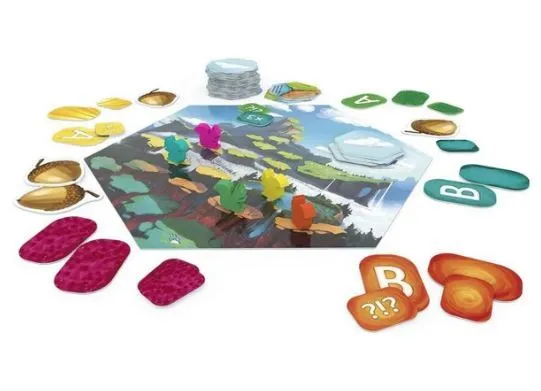 In more detail, each player has a hand of hexagonal cards, with words or phrases in three color blocks on the card. On a turn, you choose a player that has a token in front of them, take that token, then present them with a question by choosing one of the three question prompts (which are all color-coded), then choosing two cards from your hand and adding the properly-colored section of those cards to the question. A sample question: "What would you miss more if it ceases to exist: Facebook or doors?" That player secretly votes on A or B, while everyone else but the questioner secretly votes A or B depending on how they think the person will answer; a voter can optionally add their 3x scoring token to their vote.