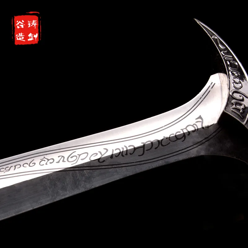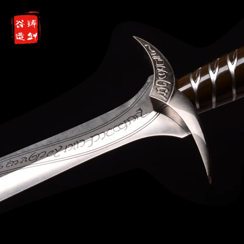 The sword features a bright, clean blade etched with the flowing Elven script of the Sindarin language. The hilt is designed with elegant Elven curves, and the handle typically features a textured, wood-like grip with silver metal fittings (as seen in the accompanying image). This display piece comes without a scabbard but includes a custom wooden wall display plaque, making it ready for immediate mounting and exhibition.