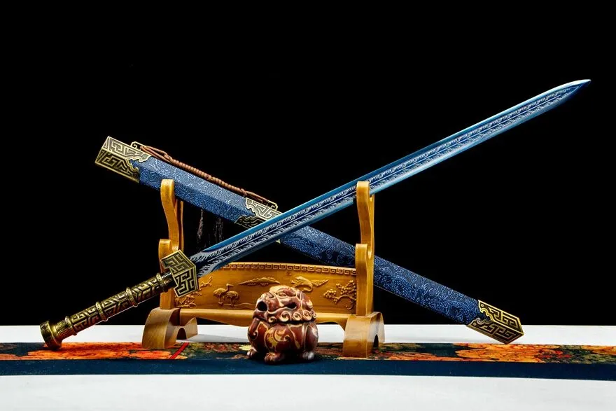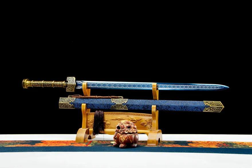 The Tianwen Han Sword is a refined piece crafted from high performance manganese steel, featuring a polished blue-toned blade with elegant engravings. Forged with traditional techniques such as hand hammering, quenching, and tempering, it embodies durability and artistry. The handle is finely detailed, and the sword comes with a decorated scabbard wrapped in wood and leather, making it ideal for stage performance, cosplay, or collection display.