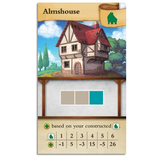 Each building scores victory points (VPs) in a unique way. When no player can place any more resources or construct any buildings, the game ends, and any squares without a building are worth -1 VP. The player with the most VP wins!