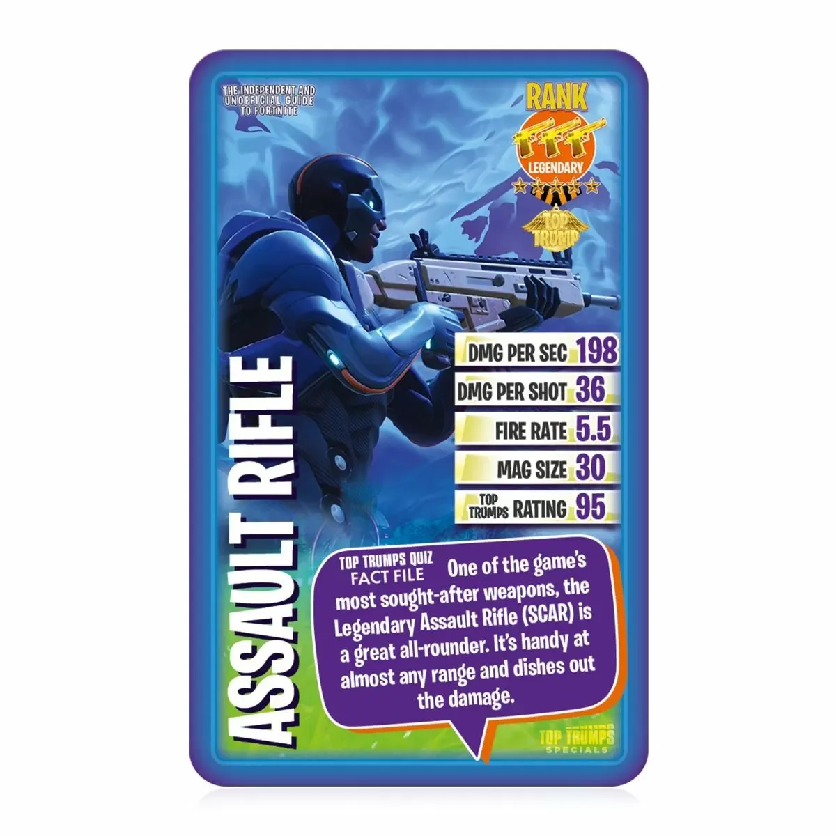 Test your knowledge of Fortnite as you deploy your weapon cards according to their strengths, fire off stats in an attempt to outrank your opponents, and loot their cards for your own. You won’t need a hundred players or a parachute to succeed here - just good old fashioned strategy and a bit of luck.