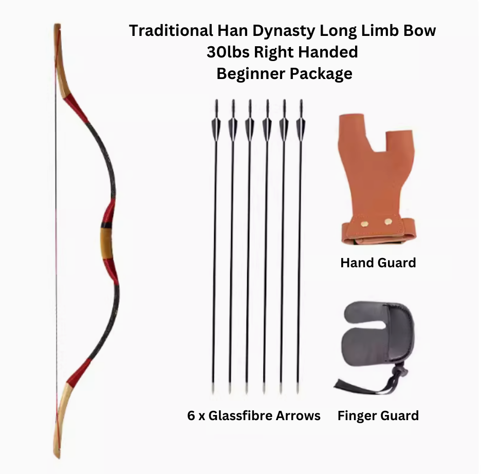 Traditional Han Dynasty Long Limb Bow 30lbs Right Handed Beginner Package
