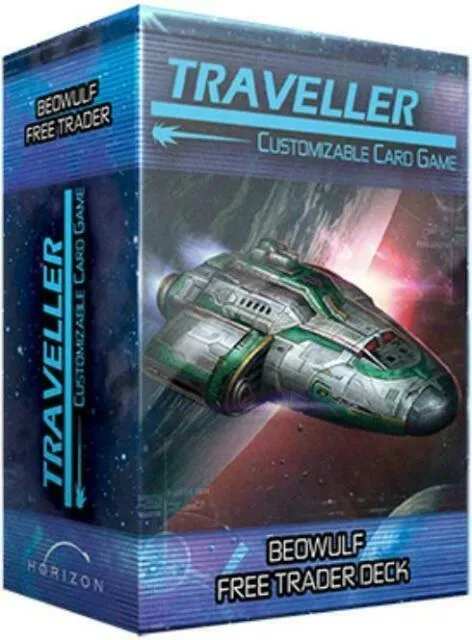 The Type A 200 ton Free Trader is a common interstellar merchant ship plying the space lanes carrying cargo and passengers. Valued for its rugged design and adaptability, the Beowulf (as it is also known) is equally at home among the main commerce lines or on the fringes of Imperial space. The Beowulf Free Trader Ship Deck includes a rules insert and 81 cards: 1 Beowulf Free Trader Ship Card 20 Adventure Cards 60 Captain’s Cards
