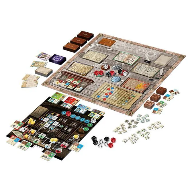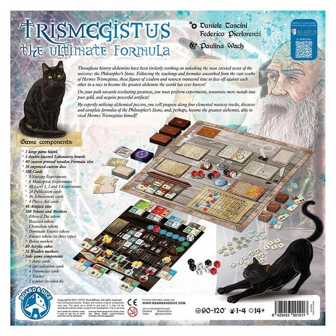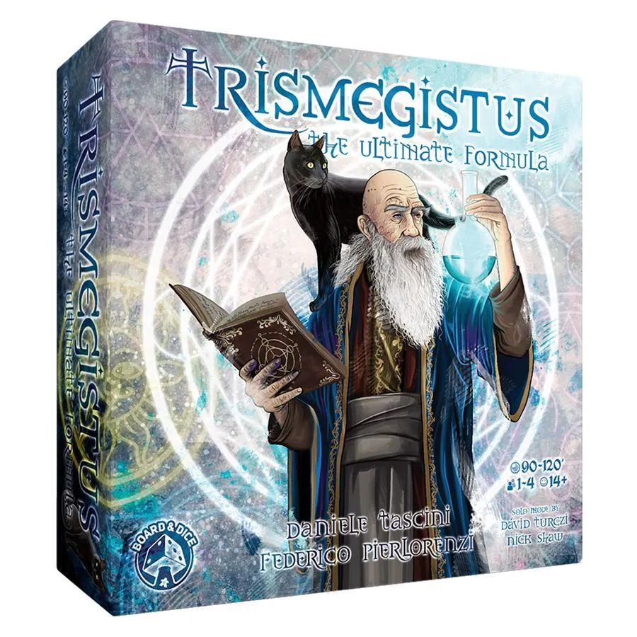 Trismegistus: The Ultimate Formula is played over three rounds during which you will draft exactly three dice. By expertly utilizing the potency of your drafted die, you will be able to transmute precious materials, collect alchemical essences, purchase and activate artifacts, and perform experiments that will progress you along four mastery tracks. You will also build a secret hand of publication cards which — together with the value of your experiments, the completed formulas of your Philosopher's Stone, and your collected gold — will determine your final score in victory points and, perhaps, make you the greatest alchemist, someone able to rival Hermes Trismegistus himself!