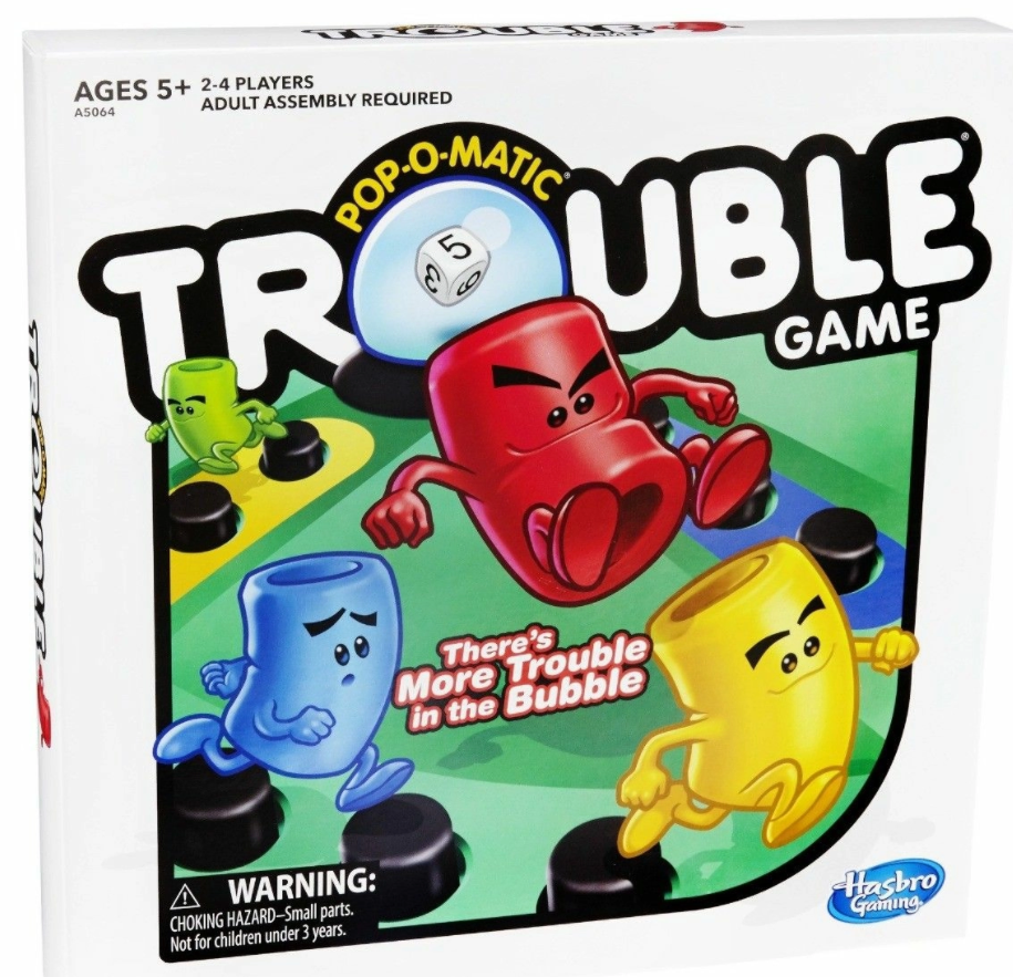 Trouble - The game that drives you POPPING MAD! Press the bubble...CLICK! Then... POP! Pop a 6 and you're off on an exciting pop-o-matic race. The first to get all 4 pieces home, wins. But remember, you're not safe until you get there.