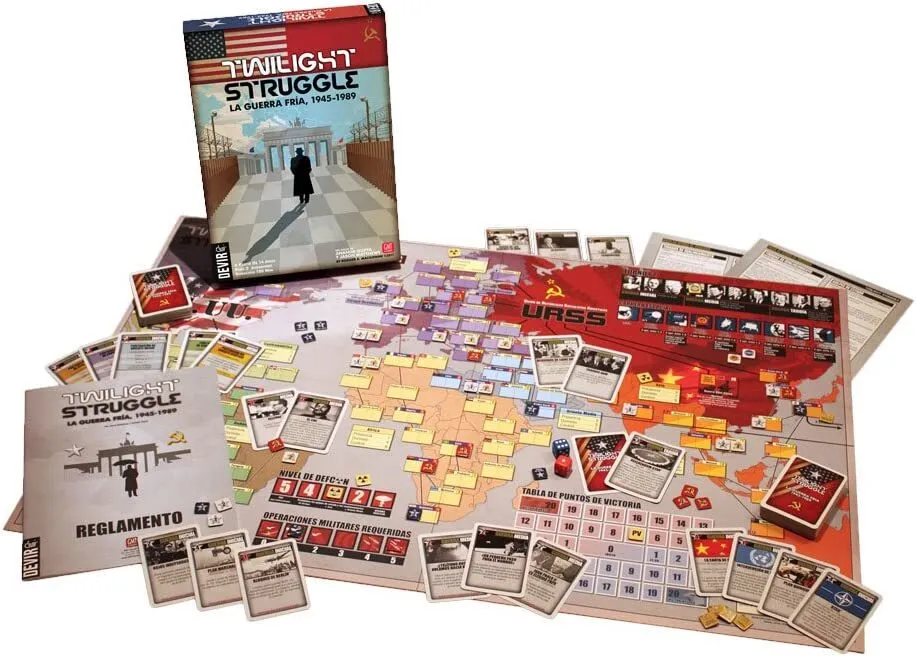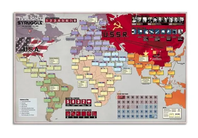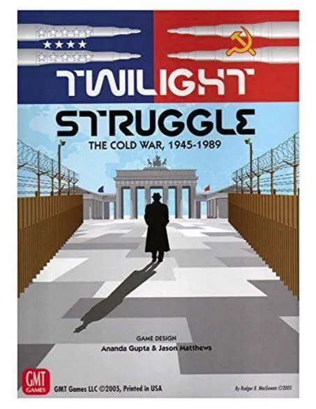 In 1945, unlikely allies toppled Hitler's war machine, while humanity's most devastating weapons forced the Japanese Empire to its knees in a storm of fire. Where once there stood many great powers, there then stood only two. The world had scant months to sigh its collective relief before a new conflict threatened. Unlike the titanic struggles of the preceding decades, this conflict would be waged not primarily by soldiers and tanks, but by spies and politicians, scientists and intellectuals, artists and traitors. Twilight Struggle is a two-player game simulating the forty-five-year dance of intrigue, prestige, and occasional flares of warfare between the Soviet Union and the United States. The entire world is the stage on which these two titans fight to make the world safe for their own ideologies and ways of life. The game begins amidst the ruins of Europe as the two new "superpowers" scramble over the wreckage of the Second World War and ends in 1989 when only the United States remained standing.