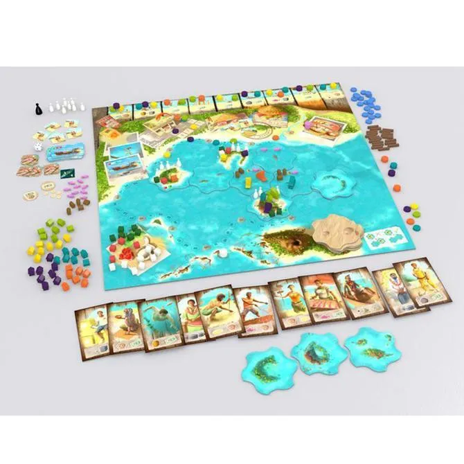On each turn, the archipelago expands and you have to program your actions with five tokens. You put one or more of them on the chosen action spaces, and on your turn, you will only be able to play an action if you have the majority on its space. Thus, sometimes have to wait for other players to remove their tokens by playing their actions. If you are not in majority anywhere, you have to remove all of your tokens from an action and give up hope of playing this action. A good strategy lets you block other players; for example, they won't be able to sell fishes if they haven't caught them first – order matters! Islands and sea resources are rare, so be quick and take them first!