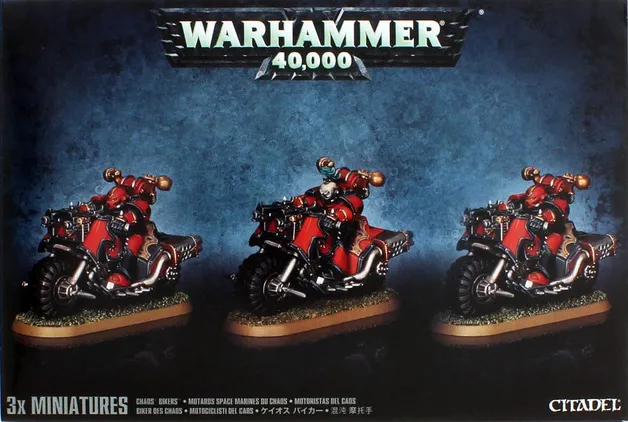 This kit builds three Chaos Bikers. Each can be customised with a choice of heads, arms, bodies and backpacks, ensuring you’ll be able to make each Chaos Biker look distinct.