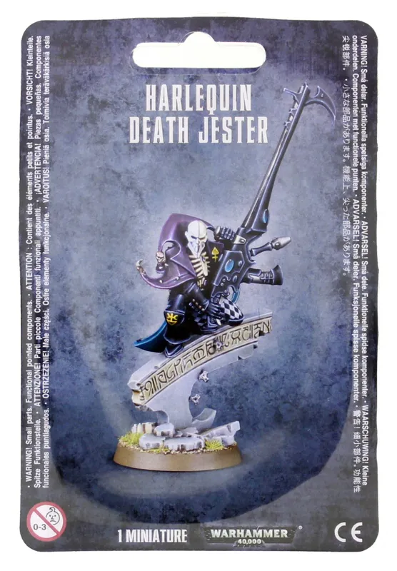 This 10-piece plastic kit makes one Harlequin Death Jester armed with a shrieker cannon, and has a choice of 2 face masks. The model is supplied with a 25mm round base.