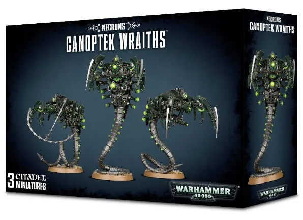This multi-part plastic boxed set contains 135 components with which to build 3 Necron Canoptek Wraiths. This set comes with 3 Citadel 40mm Round bases.