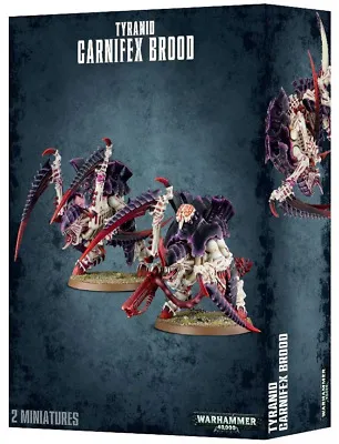 This plastic kit contains 110 components with which to make 2 Carnifexes that can be assembled as Old One Eye’s Brood, a Thornback Brood, a Carnifex Brood or a Screamer-Killer Brood.