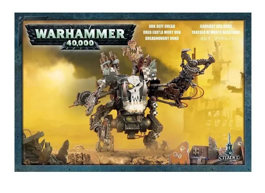 This box set contains one multi-part plastic Ork Deff Dread. This 86-piece set includes: two cockpit sights, 10 different glyphs, five different close combat weapons, two big shootas, two rokkits, two kustom blastas, a skorcha, and other assembly options. Model supplied with a 60mm round base.
