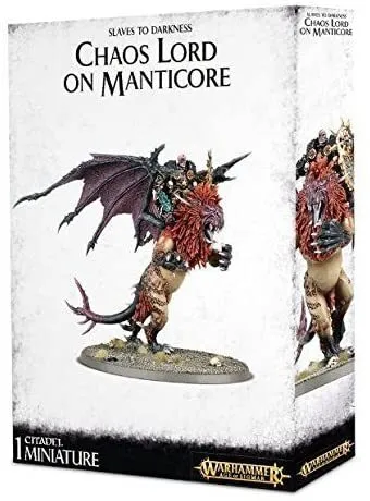 This multi-part plastic kit contains one Chaos Lord on Manticore - a finely detailed kit that comes in 62 components, and is supplied with a Citadel 120x92mm Oval base. This kit can be optionally assembled as a Chaos Sorcerer Lord on Manticore.