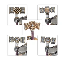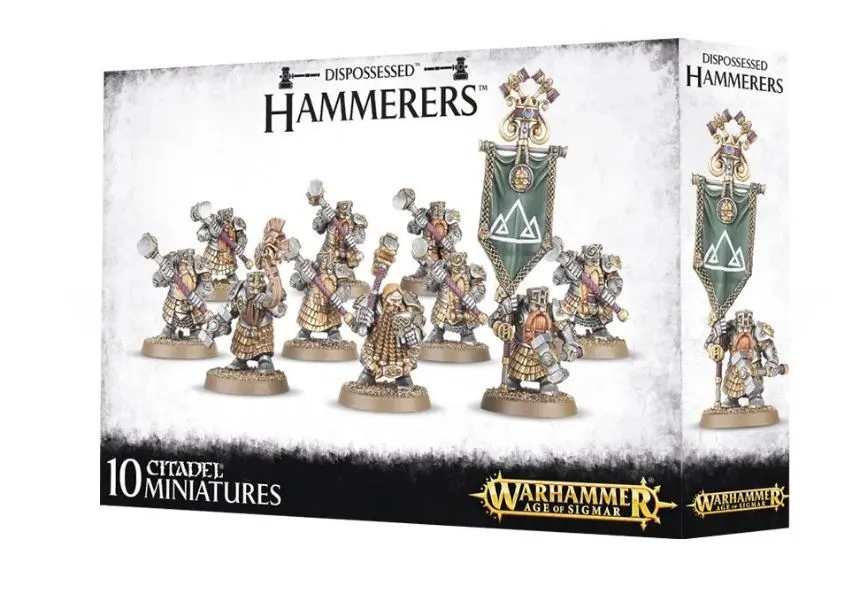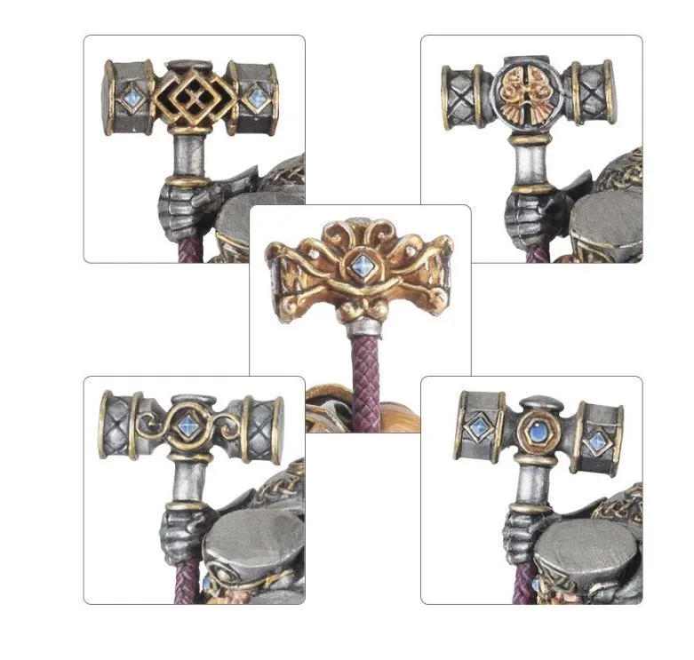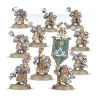 This multi-part plastic kit contains the components needed to make 10 Hammerers; each armed with a gromril great hammer. It includes options for a Keeper of the Gate, standard bearer and throng musician.