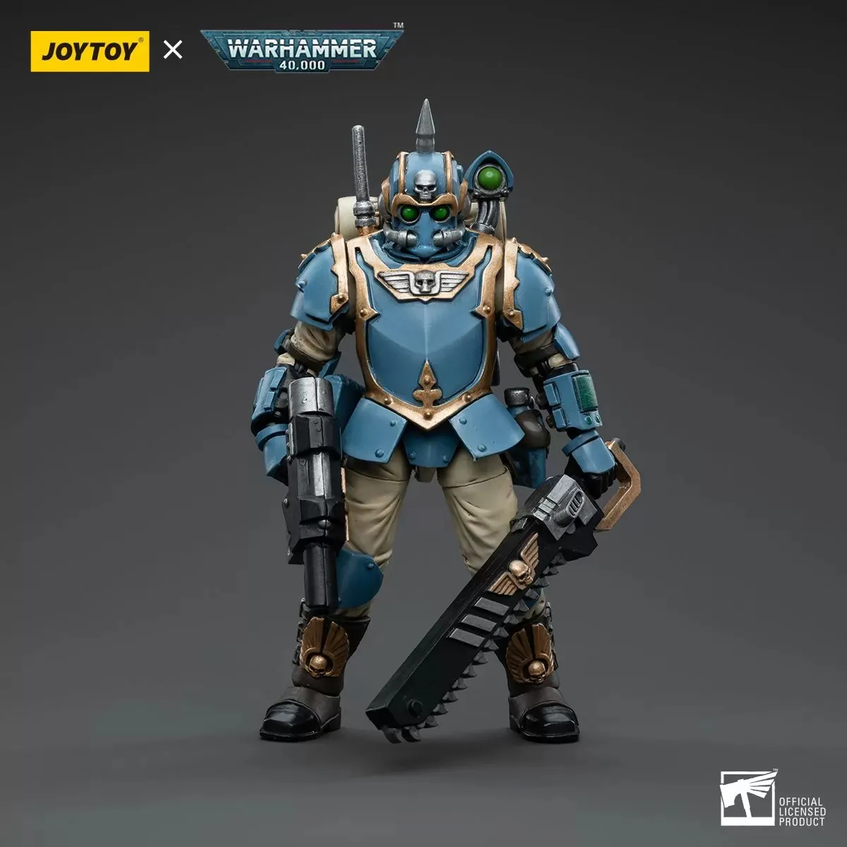 This is a 1/18 scale highly detailed, articulated figure based on Warhammer 40k's Tempestor of the Astra Militarum Tempestus 55th Kappic Eagles. The Tempestor figure stands about 4.20 inches tall and comes with several interchangeable parts and accessories, opening the door to a plethora of different and unique display opportunities.