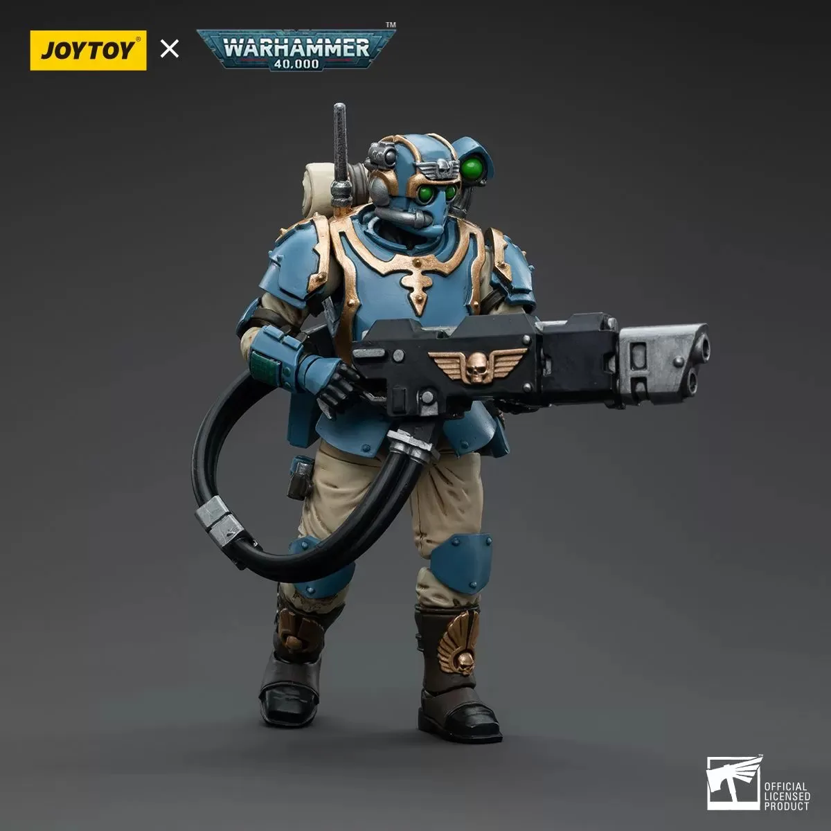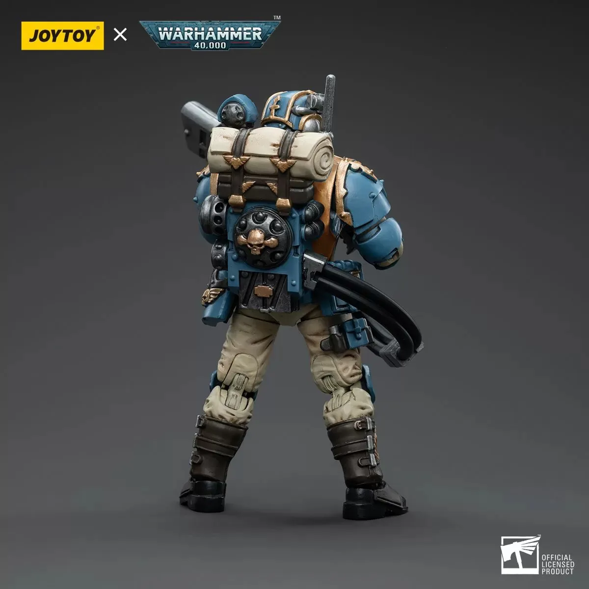 This is a 1/18 scale highly detailed, articulated figure based on Warhammer 40k's Hot-Shot Volley Gunner of the Astra Militarum Tempestus 55th Kappic Eagles. The Volley Gunner figure stands about 4.20 inches tall and comes with several interchangeable parts and accessories, opening the door to a plethora of different and unique display opportunities.