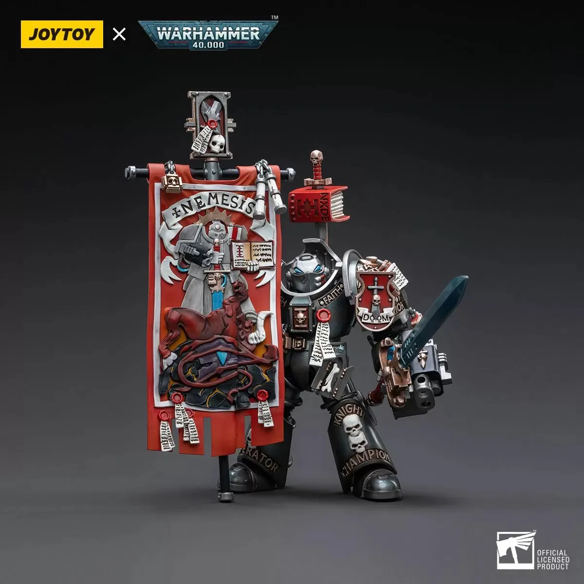Grey Knights Terminator Retius Akantar 1/18 scale figure wields a sword in one hand and an impressive banner in the other. Fight the daemonic entities with this Grey Knight figure and add it to your collection.