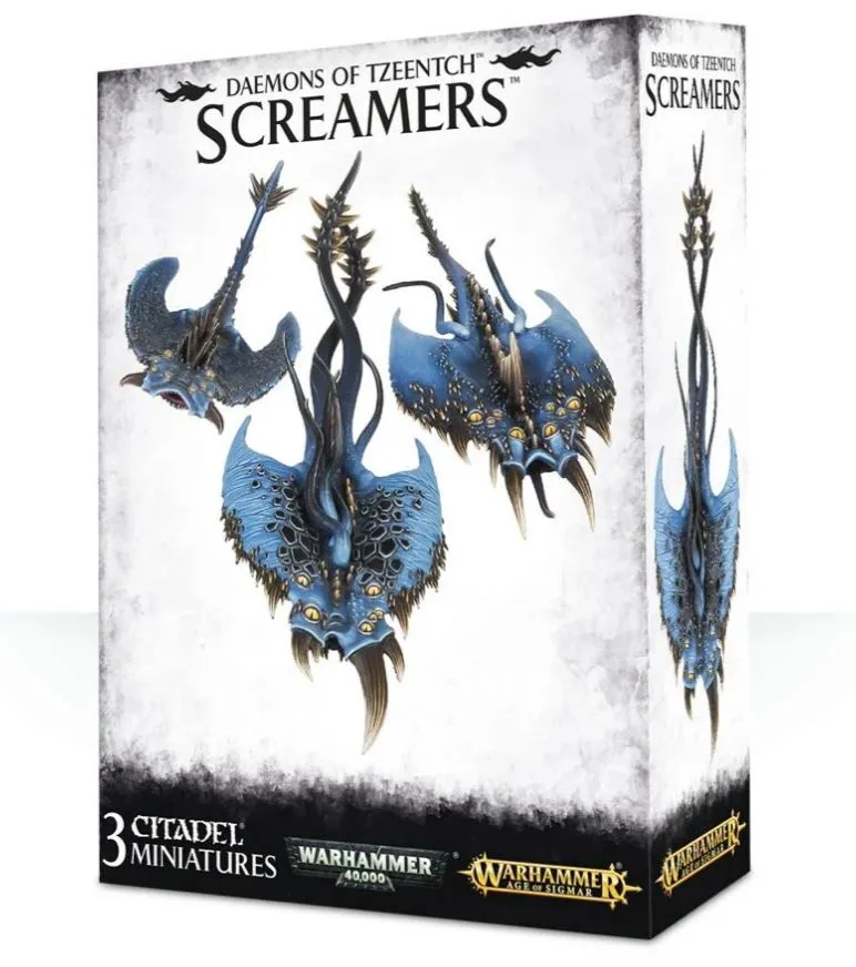 This multi-part plastic kit contains the parts necessary to assemble 3 Screamers of Tzeentch – bizarrely sleek ray-like forms, covered in eyes, horns and fins ready to slash at their foes.