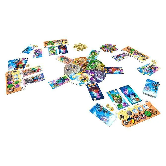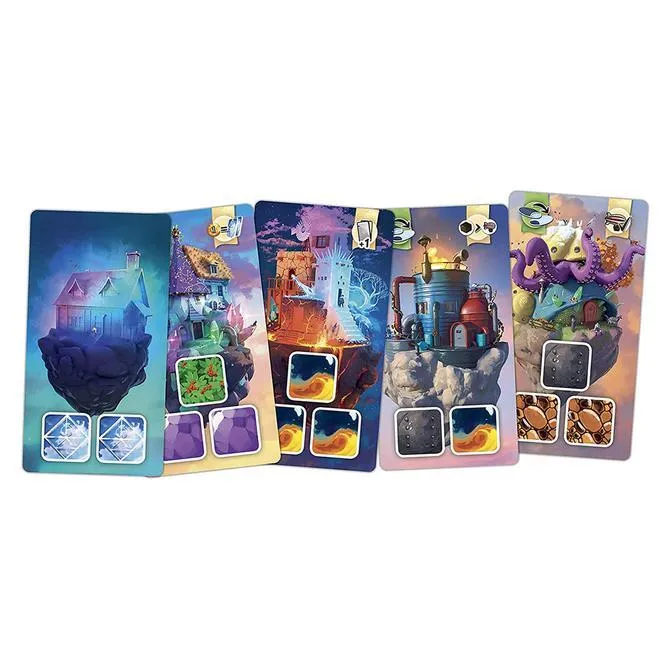 The aim of the game is to win the most gold by crafting and selling those famous floating islands. Each turn, the players/architects can either select a new island creation contract, produce resources amongst the 5 existing types, or allocate these resources on their contracts to craft them. Players have limited spaces to store these contracts and resources, so they’ll have to juggle with their production line to complete their objectives in an optimized manner!
