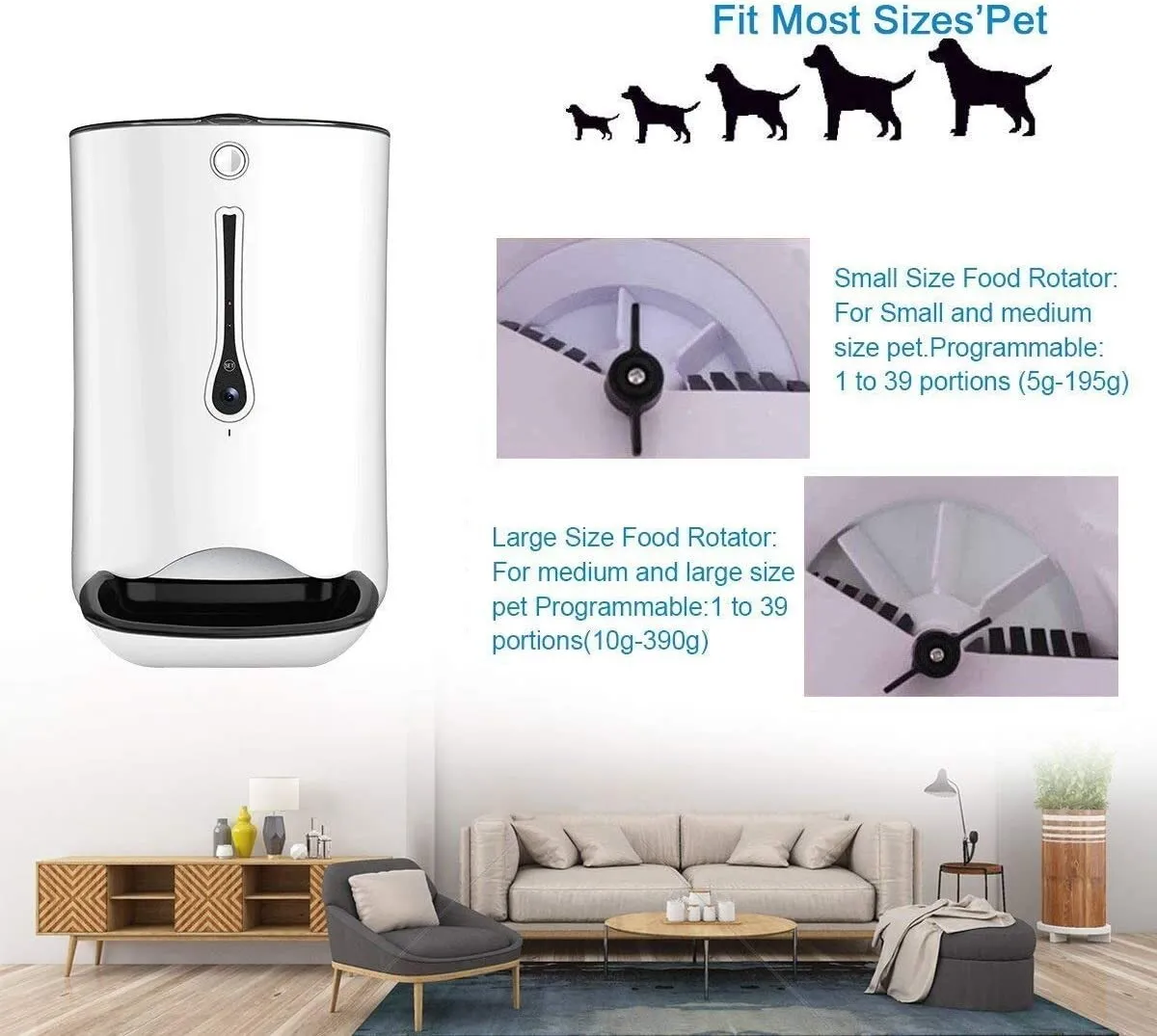 Suitable for dry food only, with the food pellet size ranging from 0.2-0.6 inches in diameter; up to 6 meals a day. Download the iOS/Android app for free. Compatible with iOS 7.5 or Android 4.0 and above. IMPORTANT - Your home WiFi network needs to be a 2.4GHz frequency in order for the pet feeder to work.