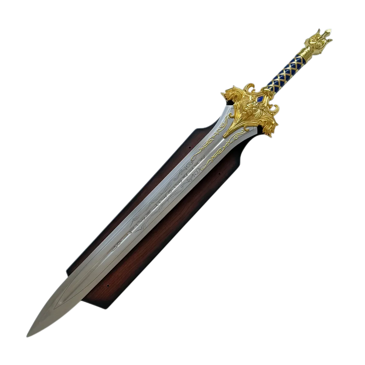 This massive, highly detailed, and gold-adorned sword is the perfect centerpiece for any World of Warcraft collector or fantasy weapon enthusiast.