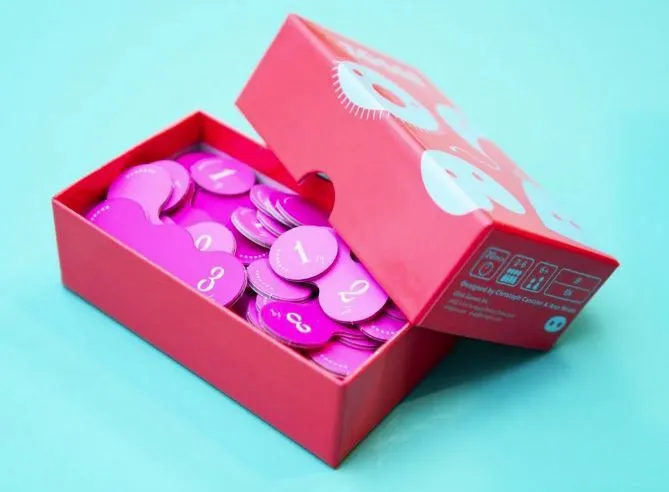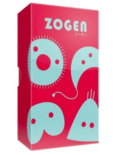In Zogen, a.k.a. ゾーゲン, the player researchers want to rid themselves of their microorganism cards as quickly as they can, but they can do so only by observing the current lab environment and watching the one thing that changes, then "recording" it by playing their card. In more detail, each player starts with a hand of sixteen cards, with each card showing 0-4 types of microorganisms, which are named "Maru", "Tsuki", "Yama", and "Siri". The start player for the round places one of their cards face up on the table, then everyone plays at once, trying to lay down a card that differs from the initial card by exactly one microorganism, whether one more or one less.