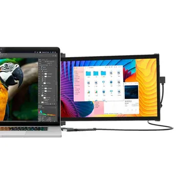 A versatile multi-purpose sliding lid acts as a protective cover when the portable second monitor is not in use, a mount that magnetically attaches to the back of the laptop or a prop stand in portrait mode.