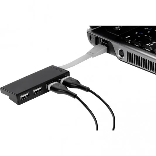 The Targus 4-Port USB 2.0 Hub is a convenient and compact way to use more USB ports than your computer has available. The hub is USB powered so there is no need to plug in an AC adapter, giving you the ability to connect up to four electronic devices to your laptop all at once. You have the capability to Sync and access your devices such as phones and External hard drives with this compact design, making it an easy solution to take it along with you anywhere you go.